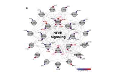 对TNF(肿瘤坏死因子)刺激的U2OS细胞中超过10,000个diGly位点进行量化,结果表明,DIA和DDA两种方法量化的泛素化位点数量相近(DIA中10,300个,DDA实验中9500个,图3b)。然而,DIA实验得到248个显著上调泛素化位点(5%FDR,中值折叠变化2.5),其中37个定位于已知参与TNF/NFκB信号传导的23种蛋白质(图3c),但DDA方法仅鉴定出38个显著上调的泛素化位点(5%的FDR,中值折叠变化4.1),其中15个定位于7个TNF/NFκB信号蛋白。