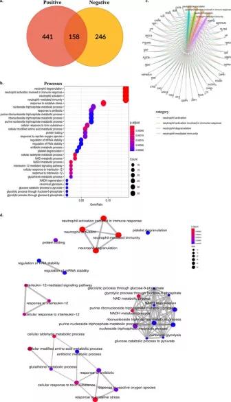 图4A为宿主蛋白的维恩图。我们鉴定出441个蛋白质存在于阳性样本中是唯一的,246个只存在于阴性样本中,158个是两组共同的。将阳性样本的蛋白质组中独特的蛋白质分类为GO terms和通路,以表征病毒感染时宿主蛋白的动态。图4B根据统计显着性显示了前30个GO terms的点图。我们发现中性粒细胞介导的免疫反应,包括脱颗粒和中性粒细胞激活通路,在阳性样本中更高(35个基因计数),这些通路中涉及的丰富蛋白质在阳性样本中富集。此外,还观察到大量参与细胞对氧化应激和有毒物质的反应和代谢途径的蛋白质,例如核苷/核糖核苷三磷酸代谢过程、NAD和NADH代谢过程、氨基酸代谢和糖酵解过程。除此之外,研究还观察到参与RNA加工机制的蛋白质数量的增加,包括调节RNA/mRNA的稳定性、剪接和对Cajal小体的定位。在宿主免疫应答中,在阳性样本中也发现了参与白细胞介素12和7介导的信号通路的蛋白。图4D显示了在阳性样本中发现的独特蛋白的通路的丰富图谱。研究结果表明,SARS-CoV-2与所有病毒一样,在生物学、分子和细胞方面操纵宿主的生存。