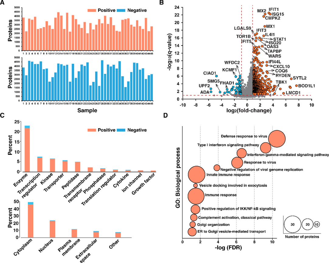 通过独创性途径分析(IPA)根据其功能和亚细胞定位对差异蛋白进行分类(图4C)。分析表明,差异蛋白为来自各种细胞室(主要为细胞质)的141种酶、46种转录调节剂和40种激酶。许多激酶在阳性样本中上调,包括TBK1、CMPK2和TAOK3。图4D为DAVID对上调蛋白质的生物过程进行了基于基因本体的富集分析。分析证明了与病毒感染的先天免疫反应相关蛋白质的显着富集,包括I型IFN和IFN-γ介导的信号通路,虽然富集在FDR>0.1时不显着,但可观察到几种与凋亡过程负调控相关的蛋白质(SERPINB10、BNIP3L、BCL2L1和HMGA2)。