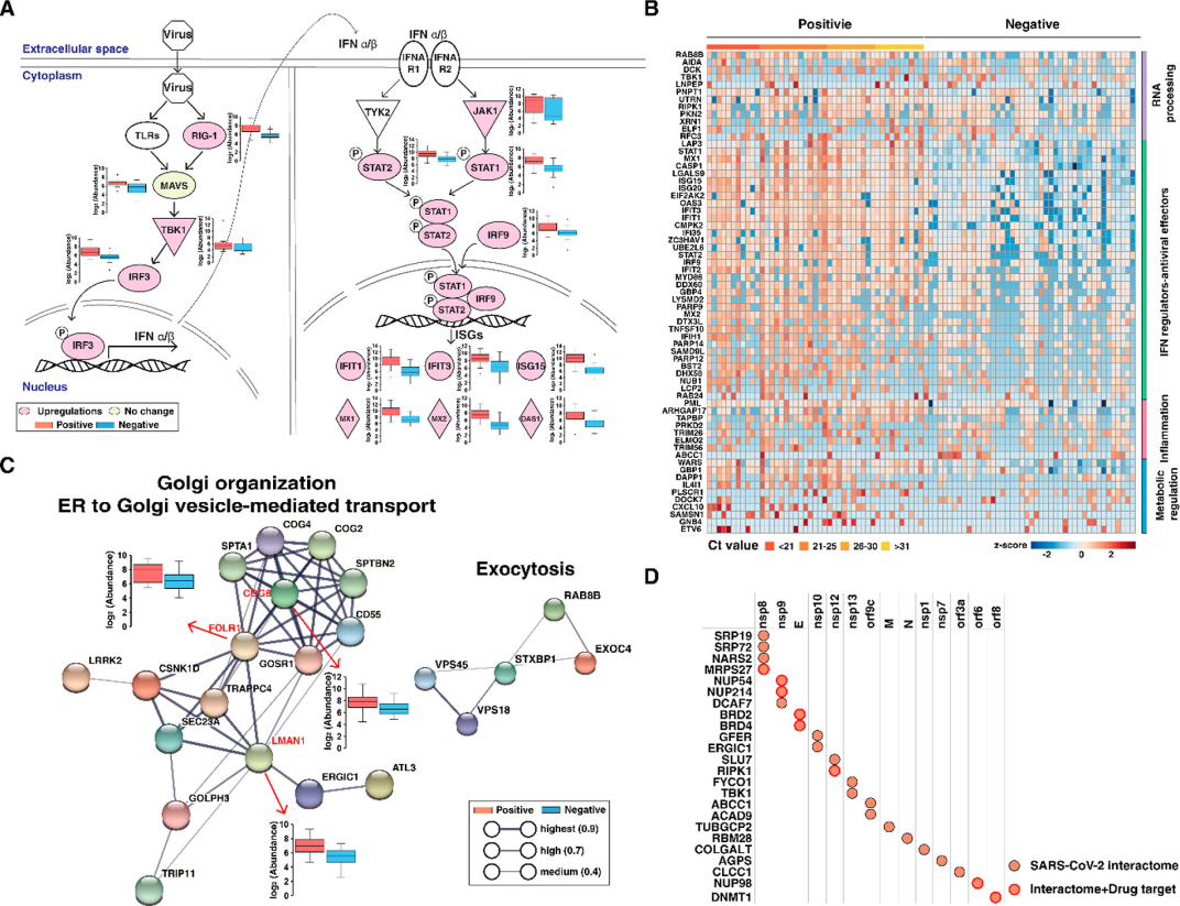 图5 SARS-CoV-2阳性受试者中上调蛋白的功能分析。(A)阳性样本中升高的代表性典型途径。描述了RIG-I样受体(RLR)和Toll样受体(TLR)介导的IFN-α/β产生和下游干扰素信号通路。显示了所选蛋白质的箱线图。(B) 90个样本中64个ISG的热图,根据其RNA过程、IFN调节剂-抗病毒效应器、炎症和代谢调节的功能进行分类。(C)与高尔基体组织、ER到高尔基体囊泡介导的转运和胞吐作用相关的分子的蛋白质-蛋白质相互作用。显示了蛋白质 COG8、FOLR1、LMAN1的箱线图。(D)已知与SARS-CoV-2相互作用的上调蛋白质。