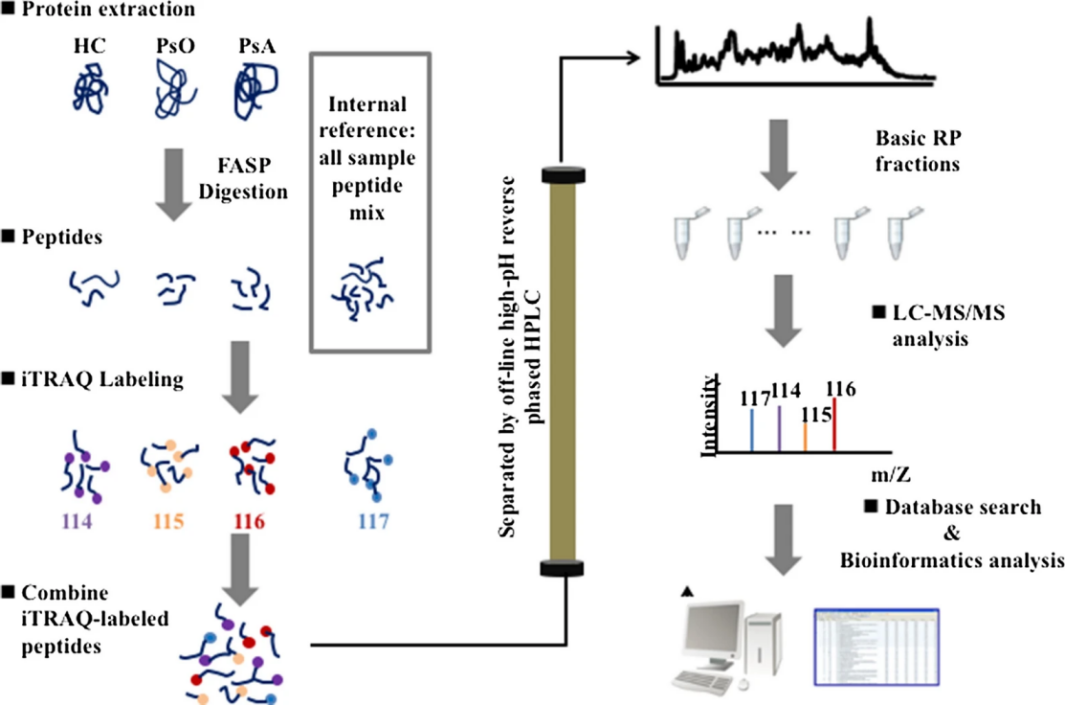 银屑病(PsO)是一种常见的免疫介导的炎症性疾病,由作为关键细胞类型的树突状细胞和T细胞和作为关键炎症细胞因子的I型干扰素(TNF-α、IL-17和IL-23)介导. 大约30%的 PsO患者最终会发展为银屑病关节炎(PsA),他们的生活质量可能会出现更显著的下降。多达29%的PsO患者就诊于皮肤科诊所可能有未确诊的PsA,而早期PsA的诊断对于皮肤科医生来说仍然是一个挑战。由于> 6个月的诊断延迟可能导致功能和影像学结果不佳,因此检测可以区分银屑病关节炎(PsA)和无关节炎银屑病(PsO)的生物标志物至关重要。外周血单个核细胞(PBMC)是利用蛋白质组学技术寻找生物标志物的合适样本,因为它们易于获得且比自由循环血浆或血清更稳定。然而,PsO患者和PsA患者PBMC的蛋白质组学分析仍有待阐明。