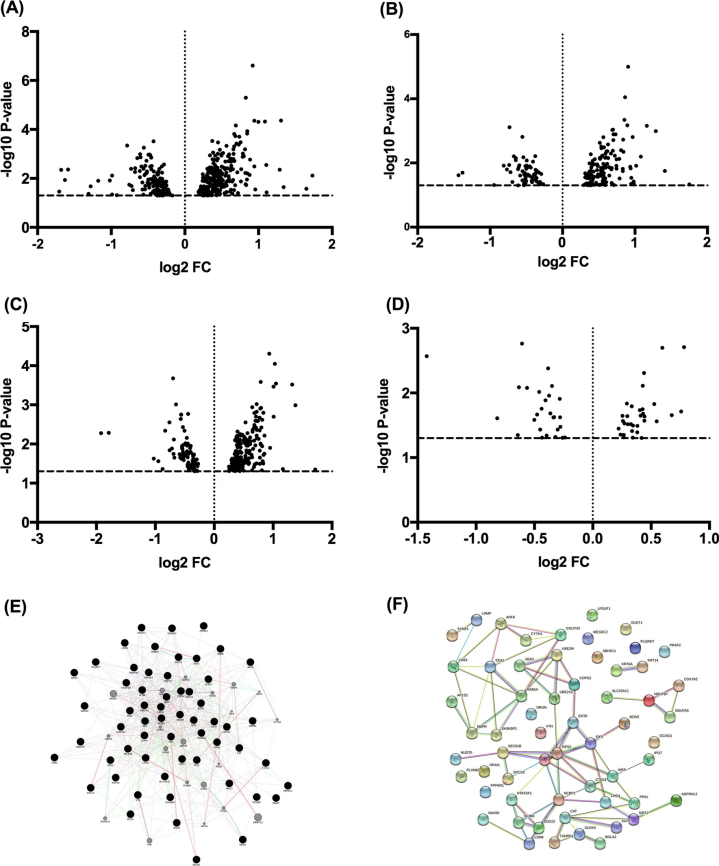 图3 不同蛋白质组表达变化的火山图(倍数变化和显著性)。(A)所有银屑病患者对比HC组、(B) PsO组对比HC组、(C) PsA组对比HC组、(D) PsA组对比 PsO组。所有组集的倍数变化都经过log2转换,并针对它们的-log10转换p值绘制。每个点代表一个已识别的蛋白质。阈值p = 0.05表示为水平线,倍数变化比率的阈值由垂直线表示。(E) GeneMania和(F) STRING中PsA组与PsO组的差异表达蛋白的关系。
