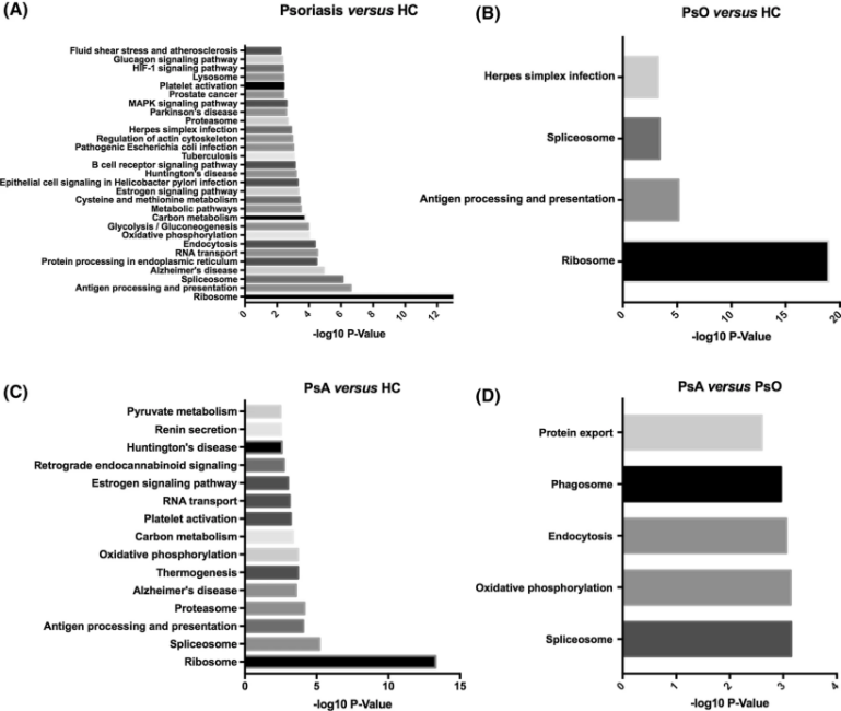 图4为四个显著变化的蛋白质组差异蛋白的KEGG通路分析。比较了8名银屑病患者(PsO和PsA)和4名健康对照,前10个高度富集通路包括核糖体、抗原加工和呈递、剪接体、阿尔茨海默病、RNA转运、内质网中的蛋白质加工、内吞作用、氧化磷酸化、糖酵解/糖异生,碳代谢。此外,在比较PsA和PsO患者时,KEGG通路分析还揭示了几个重要通路,包括剪接体、氧化磷酸化、内吞作用、吞噬体和蛋白质输出。