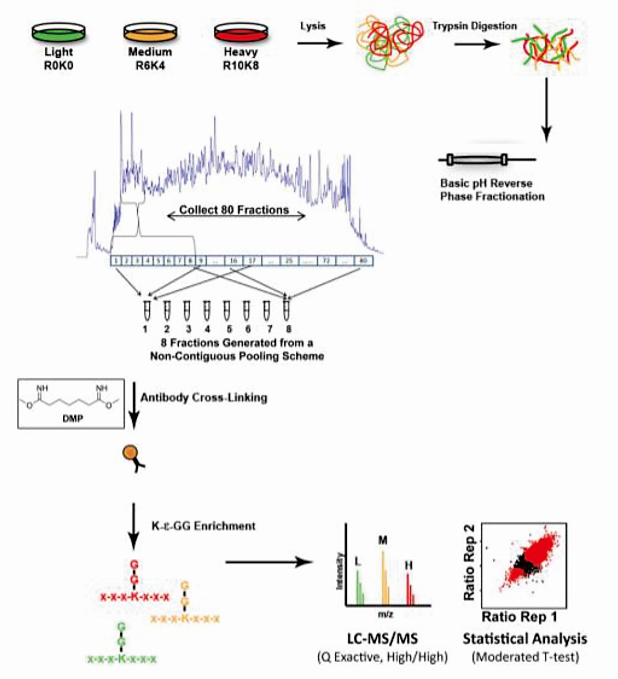 蛋白质底物上泛素化修饰在胰蛋白酶消化后将会将会留下双甘氨酸的标签(K-GG),通过采用特异性识别K-GG的抗体进行富集,并借助高分辨率质谱即可完成对泛素化修饰蛋白的鉴定工作。同时,引入稳定同位素标记培养基中的氨基酸(Lysine),即可定量泛素化修饰的变化,进而筛选E3连接酶底物。