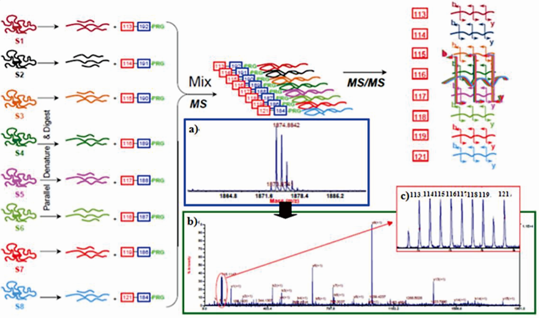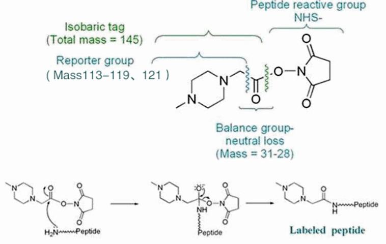 iTraq(isobaric tags for relative and absolute quantitation)通过8种同位素的标签,特异性的标记肽段的氨基基团,分别产生113、114、115、116、117、118、119和121的报告离子,在二级质谱中得到不同样品间蛋白质组的相对定量信息。
