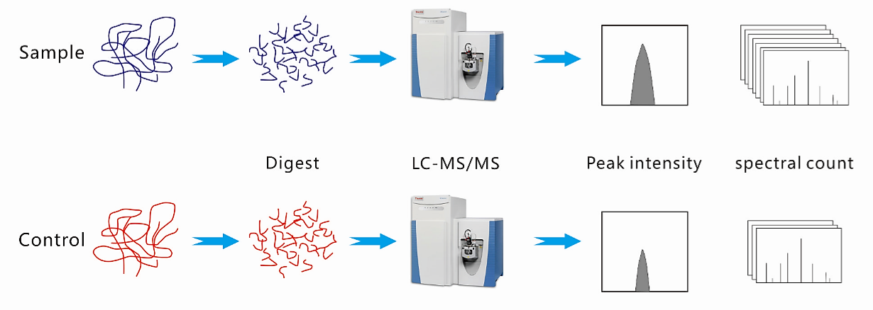 Label Free定量蛋白质组学技术是一种不依赖来同位素标记的技术,只需要大规模鉴定蛋白质组所产生的质谱,从而通过不同样品中相应肽段的信号强度完成定量分析。
