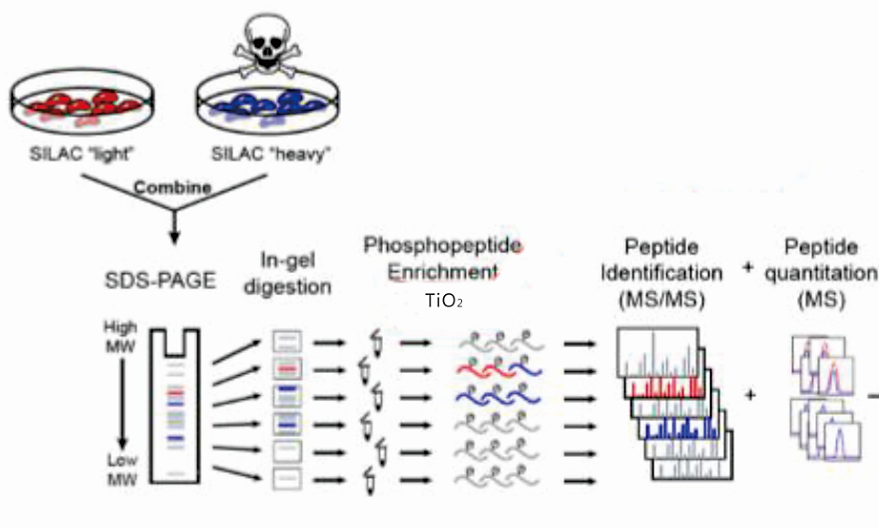 研究细胞模型中激酶或激酶抑制剂的底物,通常采用稳定同位素标记培养基中的氨基酸(Lysine和Aginine),同时结合磷酸化富集、高分辨率质谱的方法分析不同处理细胞系中的磷酸化组,并通过肽段一级谱图获得相对定量信息。