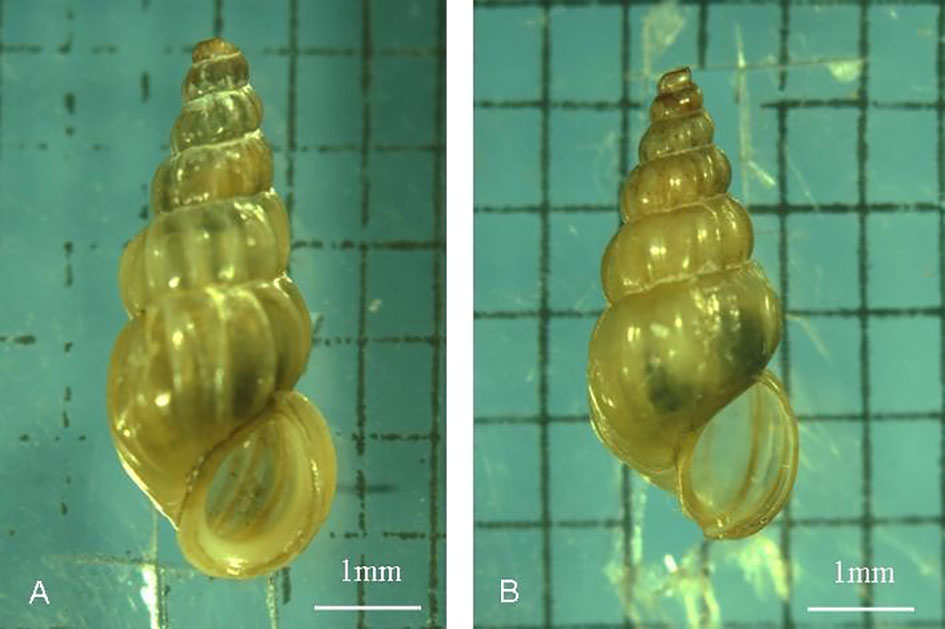 图1 不同中间宿主外观差异(左:湖北钉螺;右:微山钉螺)
