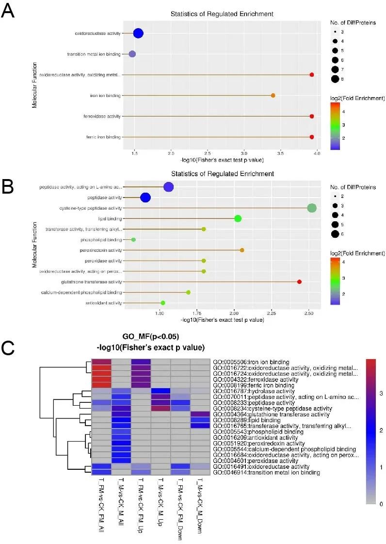分子功能分析结果显示,雌虫的DEPs显著富集在氧化还原酶活性、氧化铁酶活性、铁离子结合及氧化铁铁结合上(图10A),而雄虫的DEPs则富集在谷胱甘肽转移酶活性、一类过氧化物酶活性、钙依赖性磷脂结合等(图10B)。