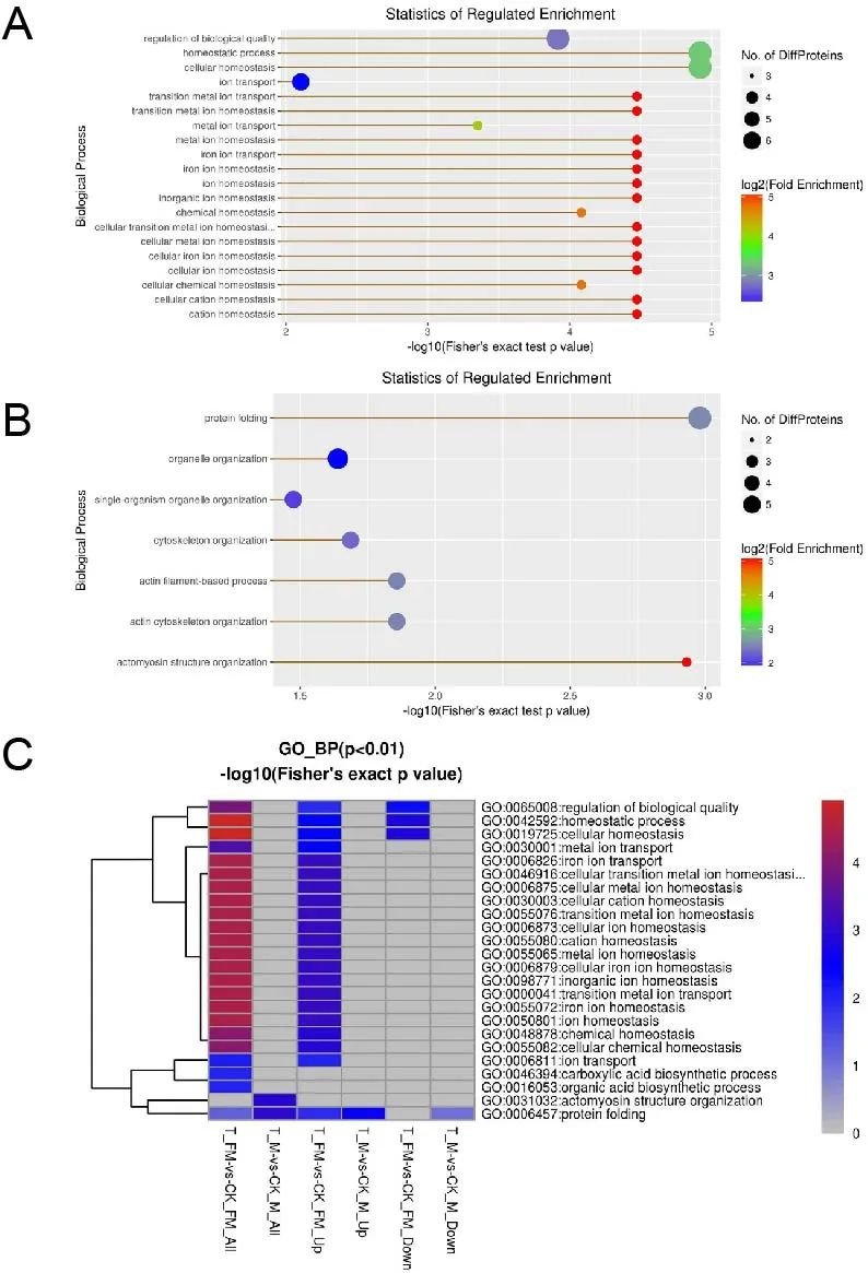 生物过程分析结果显示,雌虫的DEPs显著富集在细胞稳态、稳态过程和过渡金属离子稳态(图11A),而雄虫的DEPs则富集在肌动球蛋白结构组织及蛋白质折叠上(图11 B)。