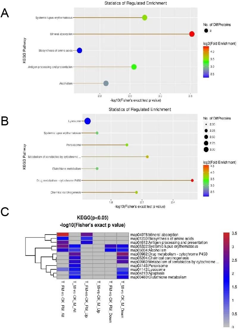 对差异蛋白进行KEGG富集分析,结果表明,雌虫的DEPs显著富集在矿物质吸收、抗原抗原处理和呈递和氨基酸生物合成(图12A),而雄虫的DEPs则富集在药物代谢(细胞色素P450)、溶酶体和过氧化物酶体等(图12 B)。雌虫的DEPs与矿物质吸收相关,而雄虫中并未出现,表明矿物质吸收在日本血吸虫雌性成虫中起着重要作用。