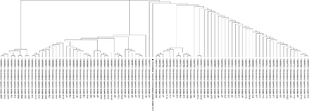 与湖北钉螺相比,微山湖地区的钉螺体型变小,壳变薄(图1)。同时,微山钉螺能适应山东的低温环境,而湖北钉螺不能适应北方的低温环境。PCR扩增了O.hupensis和O.Weishan保守的5.8S基因序列,基因测序和进化树证实O.Weishan与O.hupensis间存在一定差异(图2)。