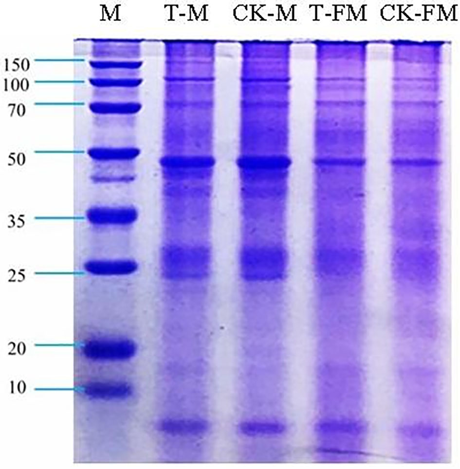 SDS-PAGE结果显示,不同宿主同性别间的蛋白存在微小差异(图3)。本次共鉴定到蛋白2364个,1901个蛋白被定量(图4)。雌性成虫中有68个DEPs,其中T_FM/CK_FM组有24个上调蛋白和44个下调蛋白;雄性成虫中有55个DEPs,其中T_M/CK_M组有25个上调蛋白和30个下调蛋白(图5、6)。
