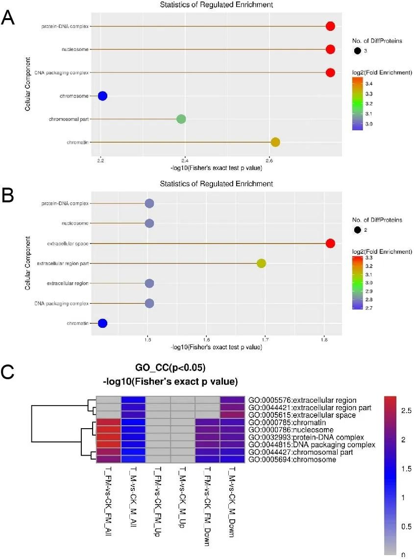 为更好地对差异蛋白进行表征,对各组差异蛋白进行GO富集分析。细胞成分分析结果显示,雌虫的DEPs显著富集在蛋白质-DNA复合物、核小体、DNA包装复合物和染色质上(图9A),而雄虫的DEPs富集在胞外区域(图9 B)。