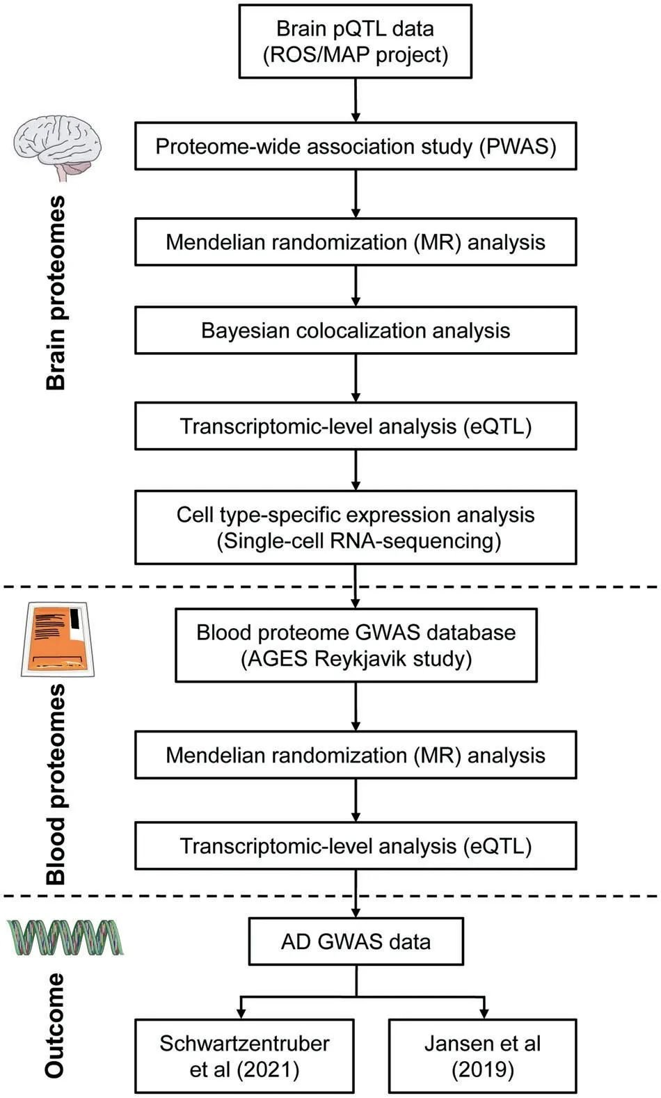 (1) 利用脑pQTL和两个AD GWAS进行PWAS分析;