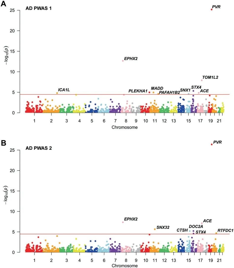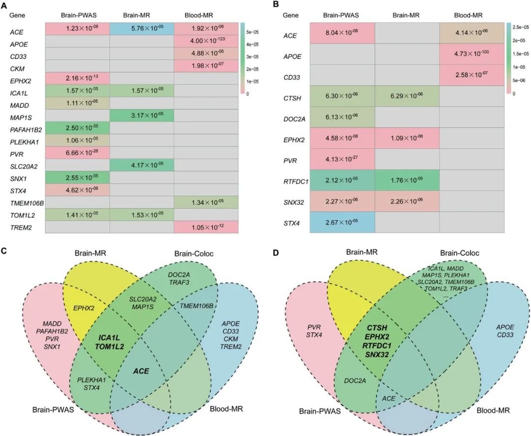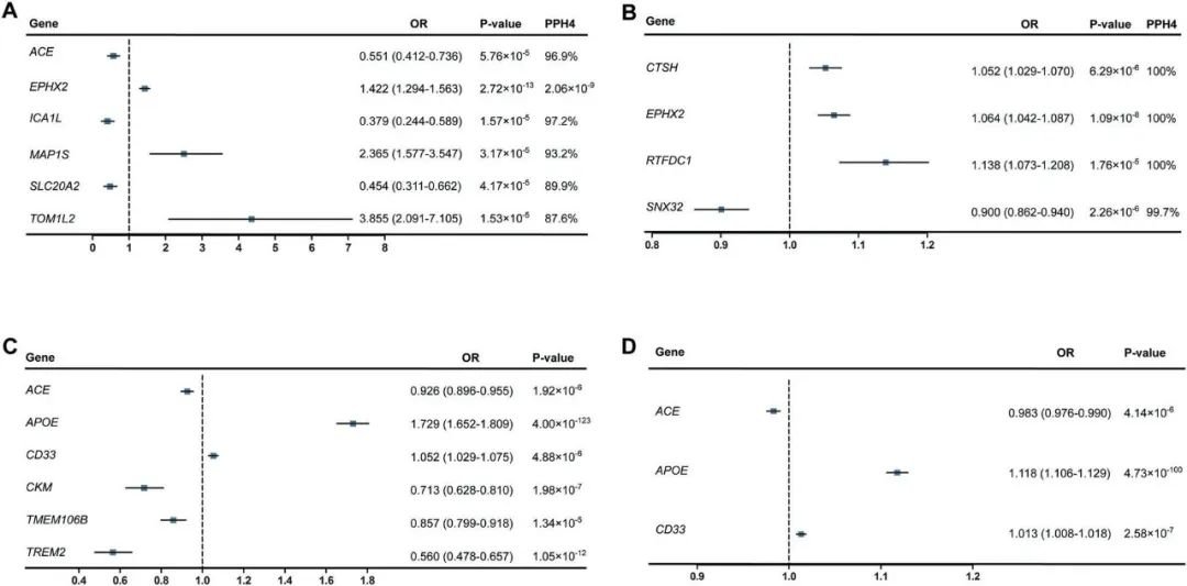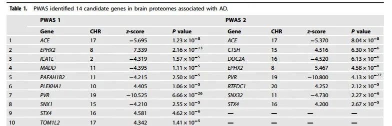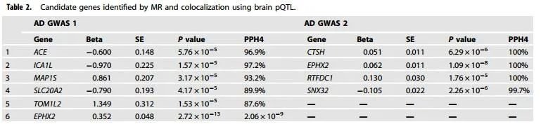 研究通过PWAS、孟德尔随机分布和共定位分析,存在7个基因ACE、ICA1L、TOM1L2、SNX32、EPHX2、CTSH和RTFDC1显示AD脑组织中存在因果关系。