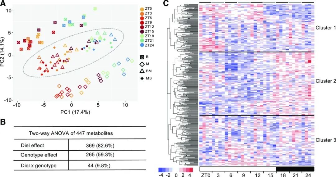主成分分析结果显示,杂交种与两亲本的代谢物分离,位于两亲本之间。在447种代谢物中,369种(82.6%)受昼夜调节影响,265种(59.3%)表现出基因型效应,44种(9.8%)表现出基因型效应和昼夜调节之间的相互作用。代谢丰度的分层聚类分析将代谢物分为三类:其丰度在清晨高于夜间(132种);在夜间达到峰值(174种);在不同时间点上基因型的丰度呈现混合模式(141种)。