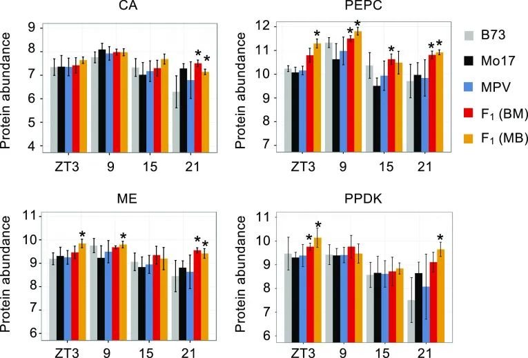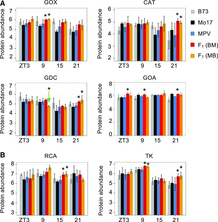 通过蛋白质组学定量分析,检测杂种玉米各关键通路中蛋白酶丰度变化状况,结果显示C4 光合途径中关键酶、光呼吸途径以及卡尔文循环中几种关键酶丰度均显著上调(图6、图7),但这种变化发生在不同时间段。