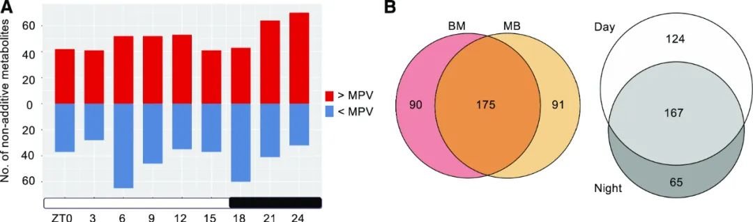 非加性积累模式: 代谢物表现出偏离双亲中值(MPV,双亲的平均值); 447种代谢物中,356种(79.6%)在一个或多个时间点上被鉴定为互反杂交种的非加性代谢物(图2A)。49.2%(175/356)代谢物为两个杂交种共享(图2B),白天非加性代谢物的数量有57.4%(167/291)与夜间的代谢物重叠(图2B)。