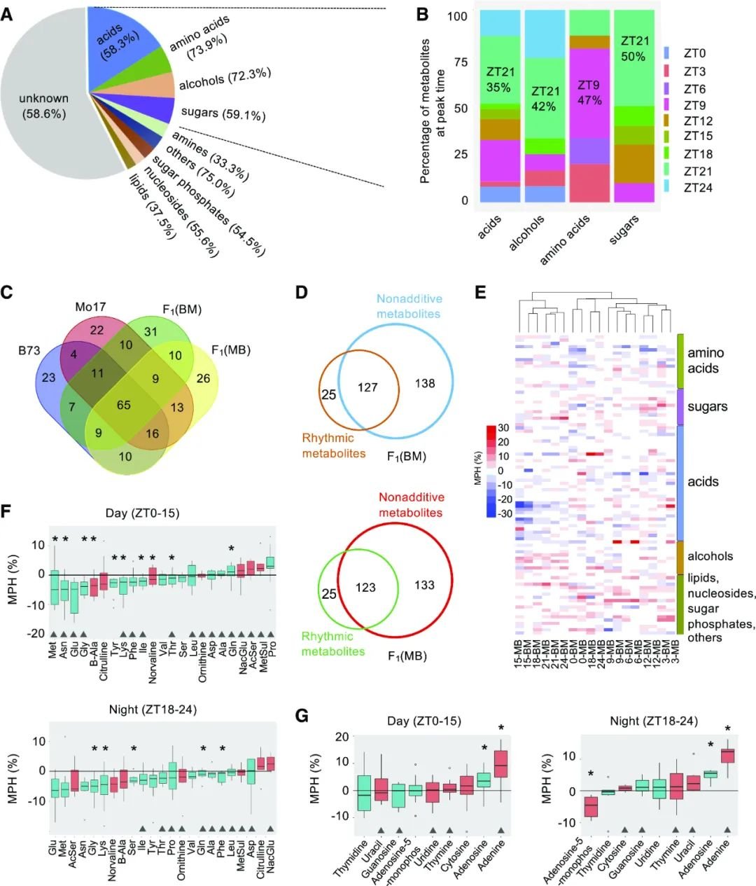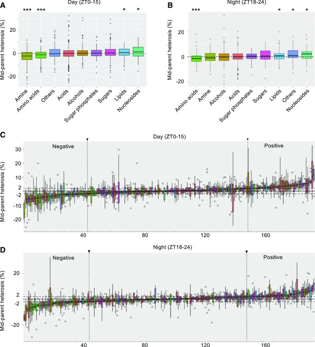 MPH(中亲本杂种优势百分比)=100%*D/A,其中“D”是杂交后代与双亲平均值(“A”)之间的偏差。在白天和夜间时间点标注的代谢物中,分别有42种(22.0%)和37种(19.4%)代谢物的绝对平均MPH“大”,在所有时间点上都>5.0%(图3C,D),这种代谢物的杂种优势规模对于玉米杂交种来说是温和的。