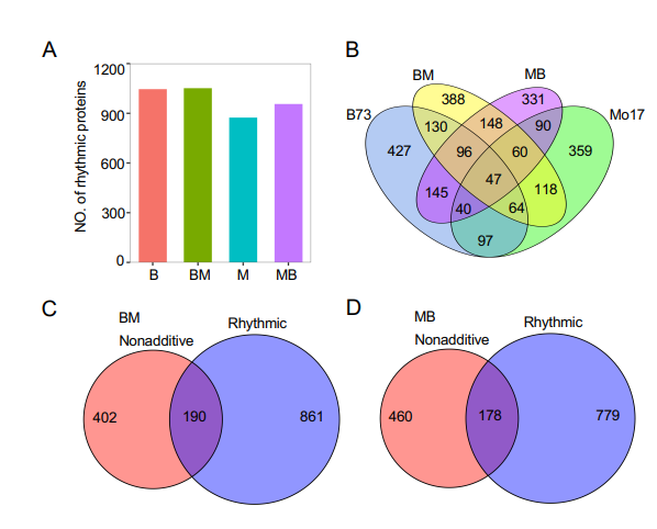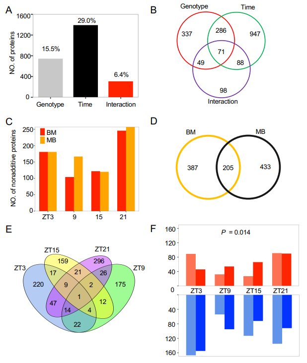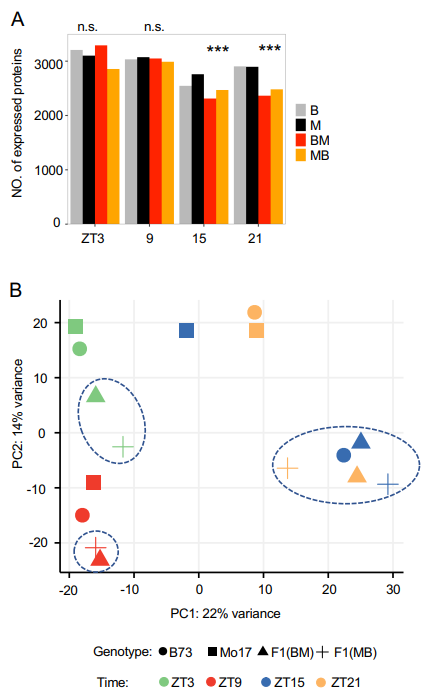 为了探究近交系亲本与杂交种代谢物差异的原因,分析了B73和Mo17及其互交杂交种(BM和MB) 4个不同时间点(ZT3、ZT9、ZT15和ZT21)玉米幼苗(9期DAP)的蛋白质组学。不同基因型和时间点的蛋白从2,312到3,290不等(补充图2A)。PCA结果显示,玉米蛋白质组在自交系和杂交种之间以及不同时间点之间存在明显的分离(补充图2B)。