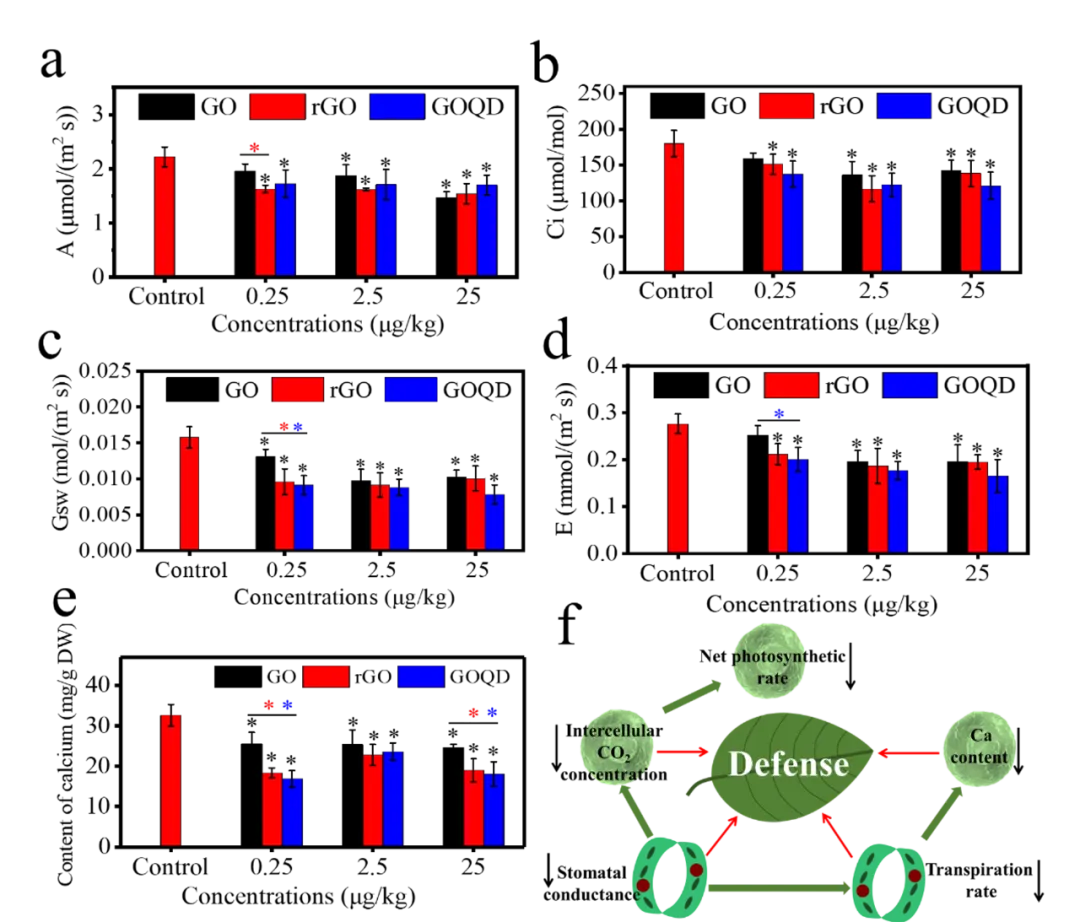 图1 GBNs对辣椒叶片光合作用的影响 (a)净光合速率(a,μmol/(m 2 s))。(b)细胞间CO2浓度(C,μmol/mol)。(c)气孔导度(gsw, mol/(m2 s))。(d)蒸腾速率(E, mmol/(m2 s))。(e)辣椒叶片中的钙含量。DW,干重。黑色“*”表示暴露组与对照组差异显著(p < 0.05)。红色“*”表示氧化石墨烯组与还原氧化石墨烯组之间差异显著(p < 0.05)。蓝色“*”表示氧化石墨烯组与氧化石墨烯组之间差异显著(p < 0.05)。