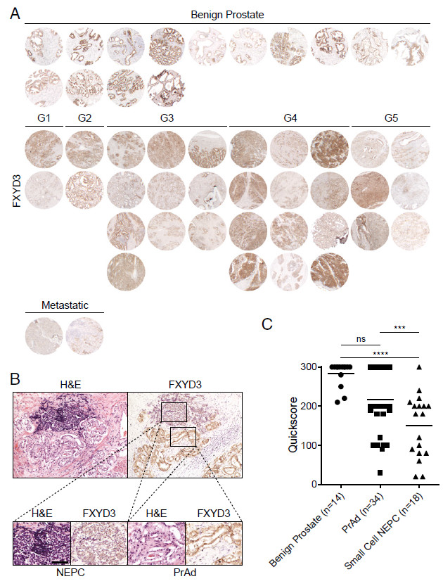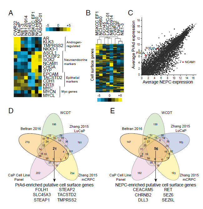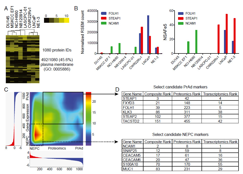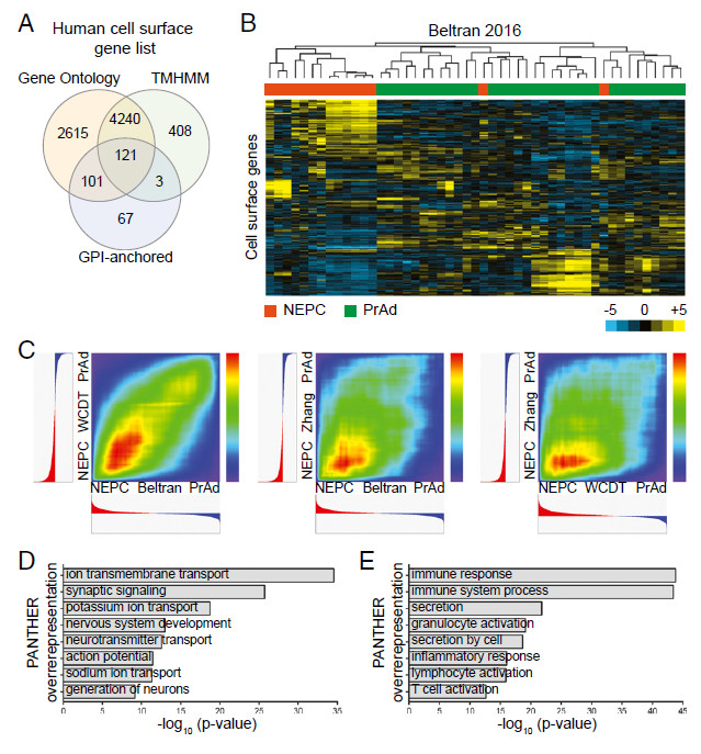 首先,利用生物信息学工具在公共数据库中提取已知的细胞表面蛋白(如图A)。然后,利用人类前列腺癌RNA测序(RNA-seq)数据和cDNA微阵列数据,对两类亚型的细胞表明蛋白进行秩相关性、GO功能富集等生物信息学分析。结果表明:NEPC和PrAd细胞表面抗原表达的显著差异与其肿瘤分化状态有关。