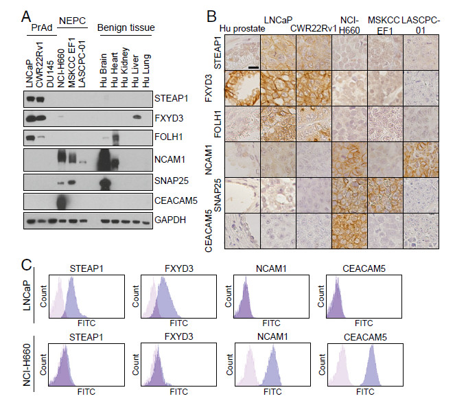 基因和转录的分析结果,仅仅代表可能性。这些基因产物是否真的表达于细胞膜上,是否具有预测的特定表达模式和特征,都需要在蛋白水平上进行确认。因此,研究员进行了蛋白质组分析。为了特异性分析细胞表面蛋白,首先通过生物素对细胞表面进行了标记,然后对生物素结合的蛋白进行了蛋白质组检测。总共鉴定到1080个蛋白,其中45.6%被注释为细胞膜蛋白。通过对基因和蛋白表达水平进行相关性分析,发现NEPC细胞系中细胞表面差异表达基因与差异蛋白质在表达水平上的相关性最高。对差异基因和蛋白在转录组和蛋白组中通过RRHO analysis(Rank–rank hypergeometric heatmap)分析,根据综合排名,将转录表达水平和蛋白表达水平均排名均靠前的基因筛选出,作为候选细胞表面标志物。然后,采用免疫沉淀和免疫组化对候选的表面抗原进行验证,接着采用流式细胞免疫技术对细胞株的分子表达进行检测。