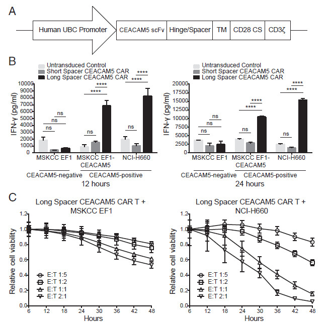 鉴于前期的研究结果,研究员试图检验CEACAM5靶向治疗NEPC的潜力。通过将基因工程改造的嵌合抗原(CEACAM5)受体T细胞即CAR-T细胞与靶标细胞NCI-H660共培养,发现上清中干扰素含量显著增加;80%-90%的NEPC细胞被杀伤。上述结果表明CEACAM5可作为靶点抗原,为进一步治疗神经内分泌前列腺癌NEPC提供了初步理论支持。