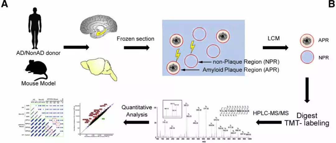 文章表示,研究者通过激光显微切割与高通量定量质谱的技术研究了AD人脑、年龄匹配的非AD人脑以及APP/PS1转基因模型小鼠中APs的蛋白组学特征。鉴定了40余种高度富集于人脑APs的蛋白组分,并且详细阐述了人脑与模型小鼠脑的异同。