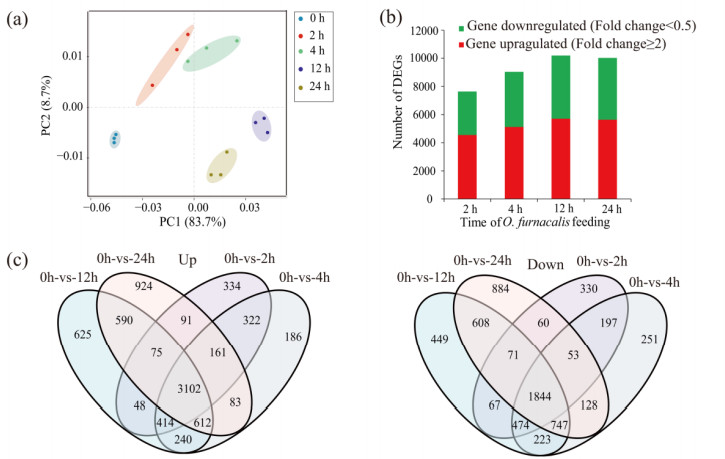 实验取材:玉米螟摄食0、2、4、12、24h后的叶片,各3个重复,每个重复4-5份植物样本混合。