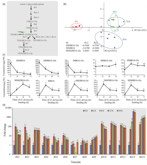 亚洲玉米螟摄食后,也引起苯并恶嗪类基因表达的显著变化。除了BX1,BX5,BX7和BX8之外的所有BX基因在亚洲玉米螟喂养期间显著上调。