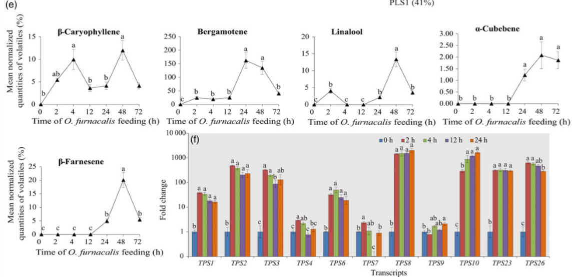 但是,对于中国大田种植的玉米品种,在受到亚洲玉米螟为害后能否诱导产生包括( E )-β-石竹烯在内的多种与防御反应相关的化合物还是未知。此外,目前已报道的有关玉米诱导抗虫性的研究主要是在温室可控条件下进行的,而田间玉米的生长环境非常复杂,玉米基因表达和化合物的含量会受到多种生物和非生物因素影响。