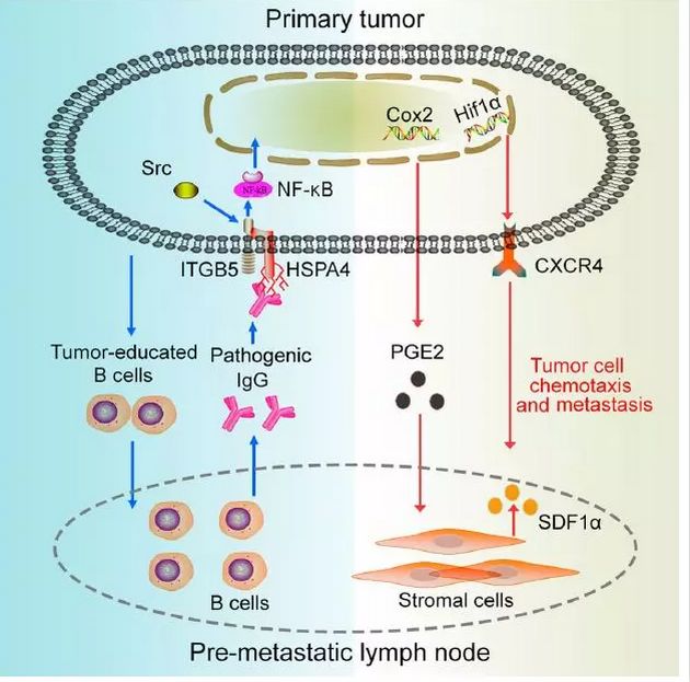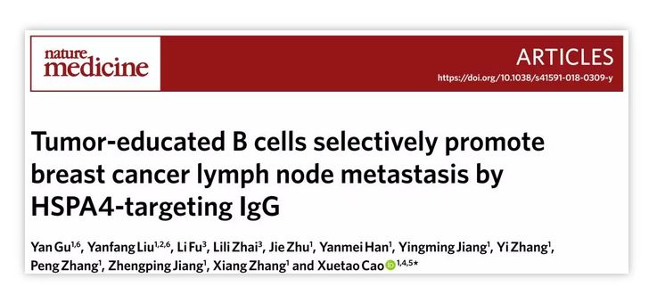 2019年1月在《自然-医学》杂志发表的这篇题为“Tumor-educated B cells selectively promote breast cancer lymph node metastasis by HSPA4-targeting IgG” 的最新研究中,研究团队利用小鼠乳腺癌原位模型,发现在肿瘤转移前,引流淋巴结中B细胞的比例与数量显著增加。并发现此类肿瘤驯化的B细胞可分泌大量抗体入血而促进乳腺癌淋巴结转移,实验性清除B细胞及其分泌的抗体,可以阻止乳腺癌淋巴结转移。