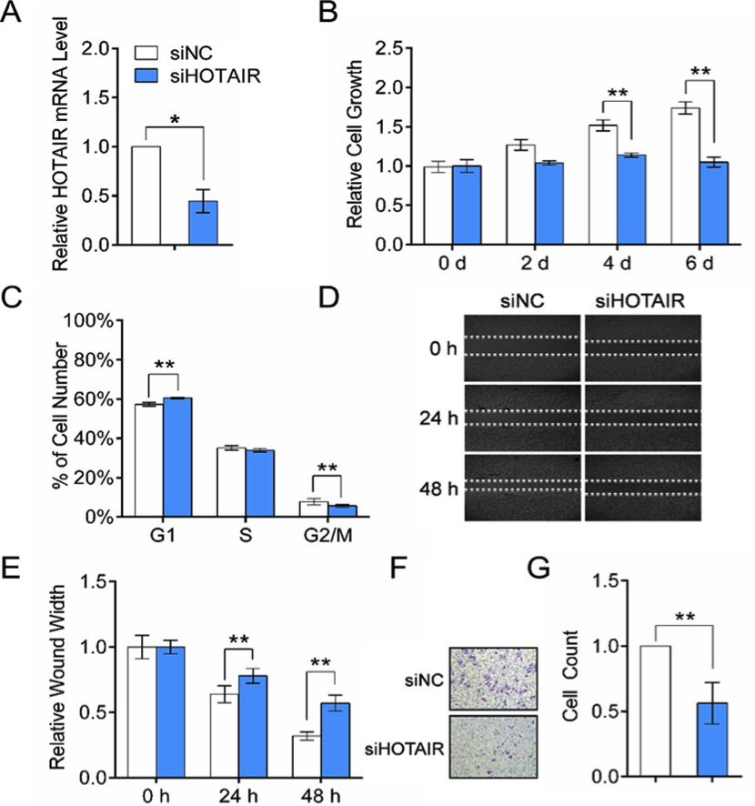 研究者们首先在培养的HepG2细胞中用siRNA干扰HOTAIR基因,使用无意siRNA做对照。观察到,肝癌细胞在HOTAIR敲除后细胞生长缓慢,大多数细胞停留在G1期(图1)。认为HOTAIR的作用对细胞周期和细胞迁移有影响,需要进一步分析。
