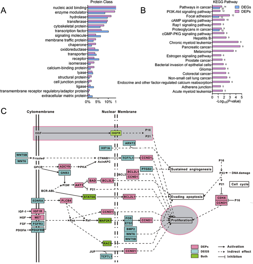 经过生物信息学分析,研究者们得到了详细的差异表达聚类分析和KEGG通路分析(图3),在KEGG的癌症信号通路中,研究者们选取了21个相关的差异表达蛋白进行进一步的验证。在Western blot实验中证实他们确实是存在差异的,而在进一步的PRM(平行反应监控)鉴定也得到了一个良好的相关性。同样在Huh-7细胞的实验,也得到了相似的结果。