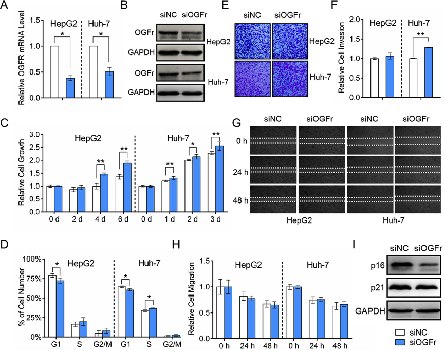有前人的研究发现,OGF-OGFr是多种肿瘤细胞中一个重要的生理学过程。而在当前的组学实验,以及qPCR,Western blot和荧光染色验证中发现(图4),OGFr的表达,在肝癌细胞中对比与周围正常细胞是低表达的。对OGFr用siRNA敲除后,肝癌细胞的增殖有了显著提升;而相反OGFr超表达使肝癌细胞的增殖受到了显著的抑制;与先前的研究相应,敲除OGFr后,肿瘤细胞在G1/S期的比例显著减少了,而超表达OGFr则G1期比例显著增加(图5)。