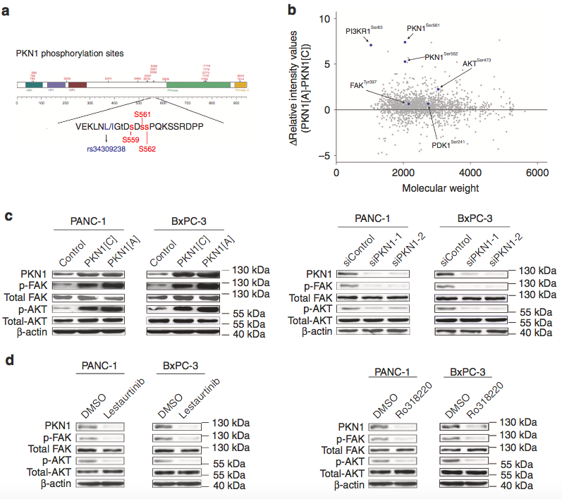 为了阐明rs34309238在PDAC发展中的作用,作者使用含有PKN1 rs34309238 [C]、 rs34309238 [A]的pcDNA3.1质粒转染PANC-1细胞,并进行磷酸化iTRAQ相对定量蛋白质组学分析。结果发现和PKN1 [C]组、对照载体组相比,PKN1 [A]中Ser561和Ser562磷酸化水平增加。此外,FAK(FAK Tyr397)、PI3K调节亚基α(PI3KR1 Ser83)、3-磷酸肌醇依赖性蛋白激酶1(PDK1 Ser241)以及PKN1 [A]转染后的丝氨酸/苏氨酸激酶1(AKT Ser473)的磷酸化水平皆有所增加(图b)。WB实验进一步验证了FAK Tyr397和AKT Ser473的磷酸化水平增加结果(图3c)。同时,siRNA敲低PKN1后可以降低磷酸化FAK Tyr397和AKT Ser473水平(图c)。