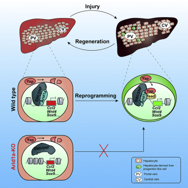 该研究首次将染色体重塑蛋白Arid1a介导的表观遗传调控和体内肝细胞重编程调控建立联系。并通过在肝细胞中特异的敲除Arid1a发现抑制肝细胞重编程会导致肝脏损伤再生的缺陷,然后进一步说明了肝细胞重编程是肝脏损伤再生的一种重要方式:1. 在小鼠成纤维细胞肝向转分化的系统中,体外转录因子诱导的肝细胞基因染色体重塑会激活ATM/p53所介导的染色体重塑“检查点”,从而抑制了细胞命运发生的改变;2. Yap对重编程基因的转录激活,使肝细胞具有响应Hippo/Yap信号通路潜能的分子基础。
