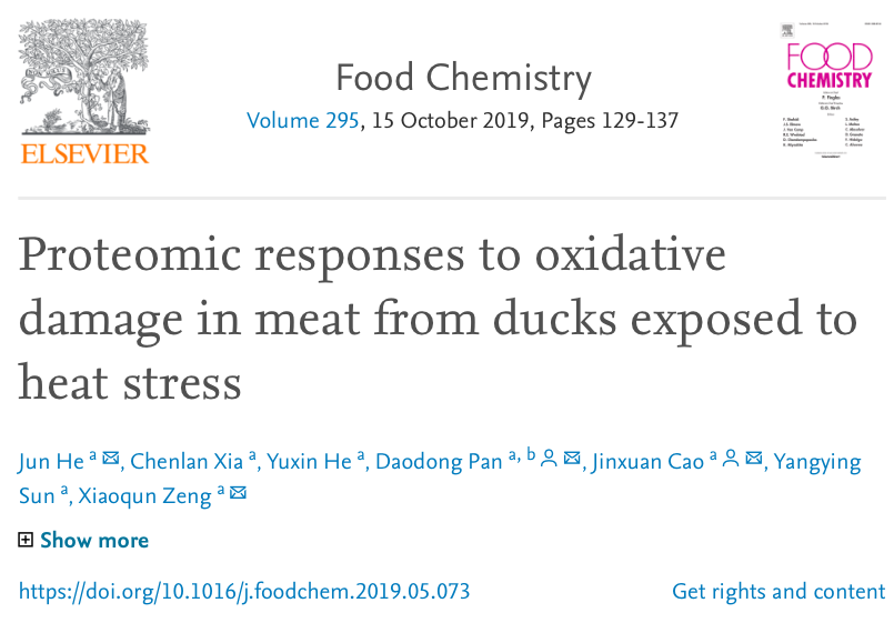 近日,Food Chemistry杂志发表了宁波大学食品与药学学院潘道东教授的题为“Proteomic responses to oxidative damage in meat from ducks exposed to heat stress”的研究论文。
