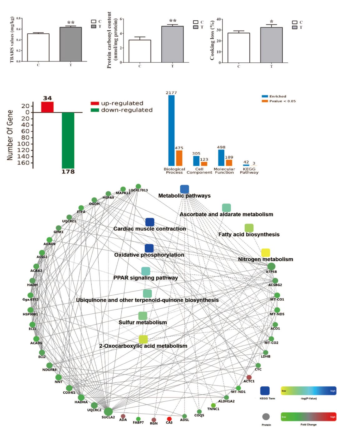 本研究发通过定量蛋白组学分析发现热应激过程中212个蛋白发生差异表达,其中:178个蛋白发生下调,34个蛋白上调。GO注释和KEGG通路分析表明,差异蛋白主要富集于oxidation-reduction process、mitochondrion、catalytic activity、oxidative phosphorylation等分类和通路,推测热应激主要通过破坏肉中线粒体功能和呼吸链反应,促使活性氧簇ROS过量堆积,最终导致鸭肉氧化程度升高。同时组学数据表明常见凋亡通路相关酶类并未出现显著调控。