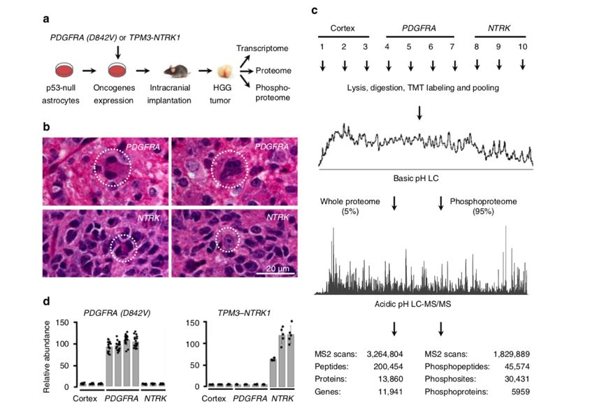 主成分分析和层次聚类分析显示,两种RTK癌基因驱动不同的蛋白质组,磷酸化蛋白质组和转录组谱。在MS分析中,组内重复样品显示出具有低标准偏差的最小变化,而组间比较显示出具有更大标准偏差的差异。对于转录组分析,来自第二组HGG的RNAseq显示出这些HGG小鼠模型的高重复性(R^2> 0.95)。此外,在小鼠HGG中表达的突变体PDGFRA或NTRK融合基因的表达水平与具有这些突变的人肿瘤细胞中发现的表达水平相关。