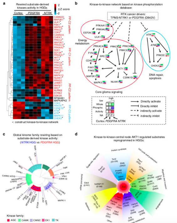 在HGG中鉴定了多种已知的神经胶质瘤中的激酶,包括AKT,PKC,MAP激酶级联和SRC家族激酶。调节细胞内的其他关键激酶也被重新连接,包括AMPK(PRKAA1,PRKAA2)和p21激活的激酶(PAK1,PAK3)。AMPK是一种代谢主传感器,可调节葡萄糖转运蛋白GLUT4的产生,脂肪酸β-氧化。PAKs调节细胞骨架重组和细胞运动。与正常皮质相比,HGG还显示更高水平的CDK5,CAMK2A和CAMK2D。