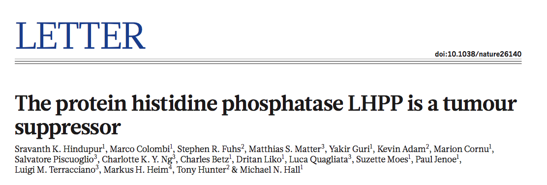 Sravanth K. hindupur, et al. The protein histidine phosphatase LHPP is a tumour suppressor. Nature. (2018) 10.1038