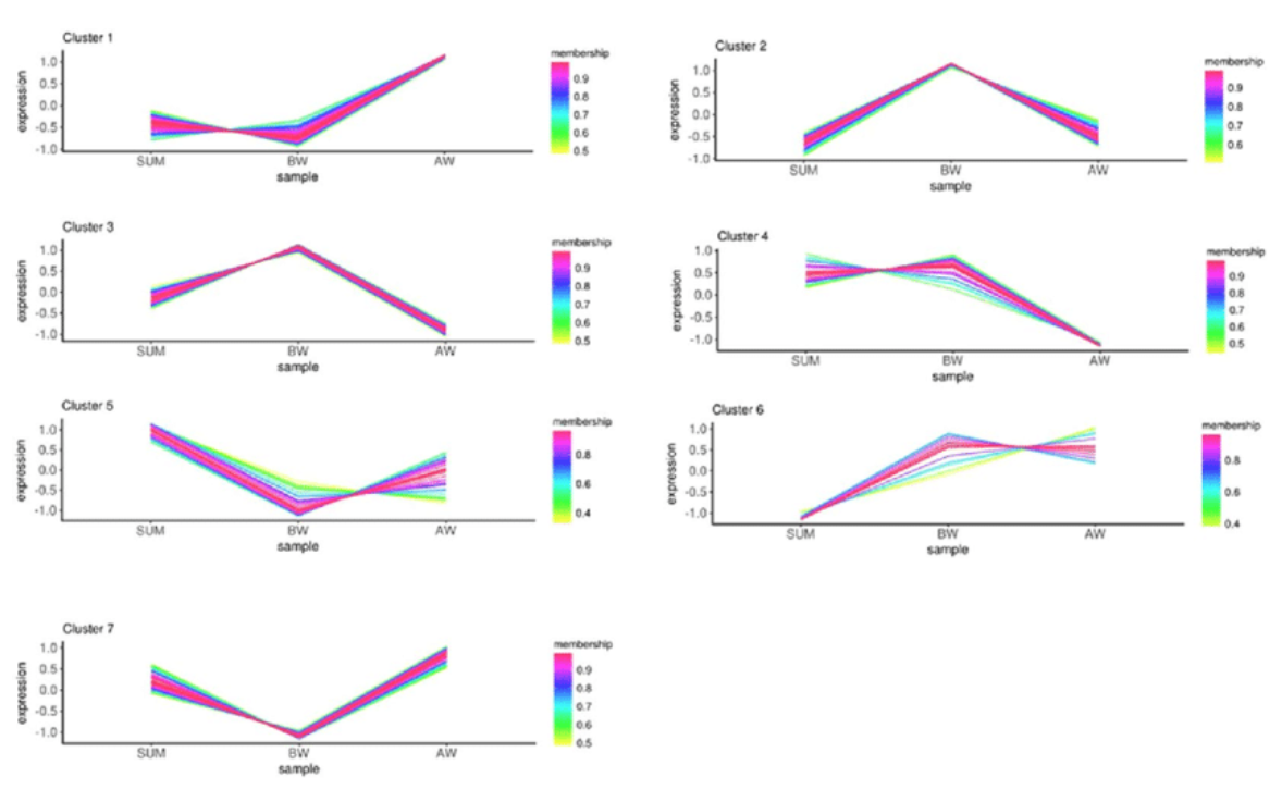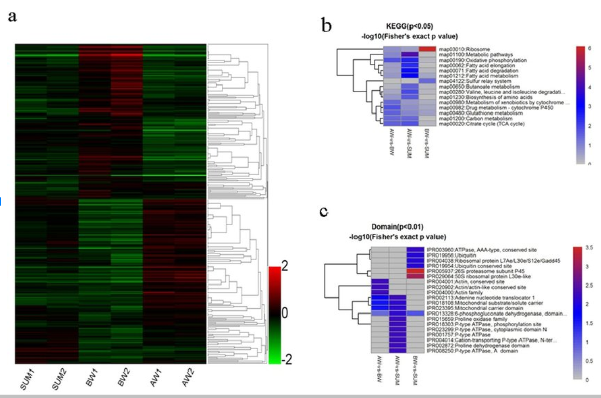 研究人员使用分层聚类来描述与非滞育阶段控制相比,滞育准备和越冬滞育维持阶段表达的变化。明显的区别表现在BW和AW(图3)。几乎所有蛋白质富集的高峰和低谷变化都发生在BW中,说明Cx中各种蛋白质丰度的变化是对越冬准备的响应。研究发现,在蚊子的长期进化过程中,越冬滞育的个体生态现象非常重要(图4)。