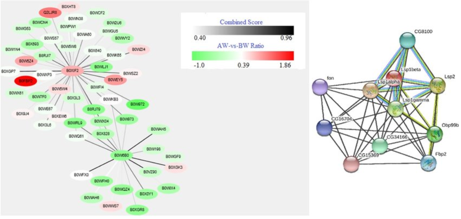 此外,存在光转导通路,暗示此蚊子的一个重要调节功能(图5)。在光转导通路中表达差异的蛋白肌动蛋白,肌动蛋白-87e(BOWEY5),肌动蛋白(BOFBP2)和肌动蛋白(A0A173GY68)在BW和SUM中表达下调,而在AW和BW中表达上调;肌动蛋白-2(BOWEY6)在AW和BW中表达下调。表明肌动蛋白可能在光转导通路调控过程中发挥了重要作用。