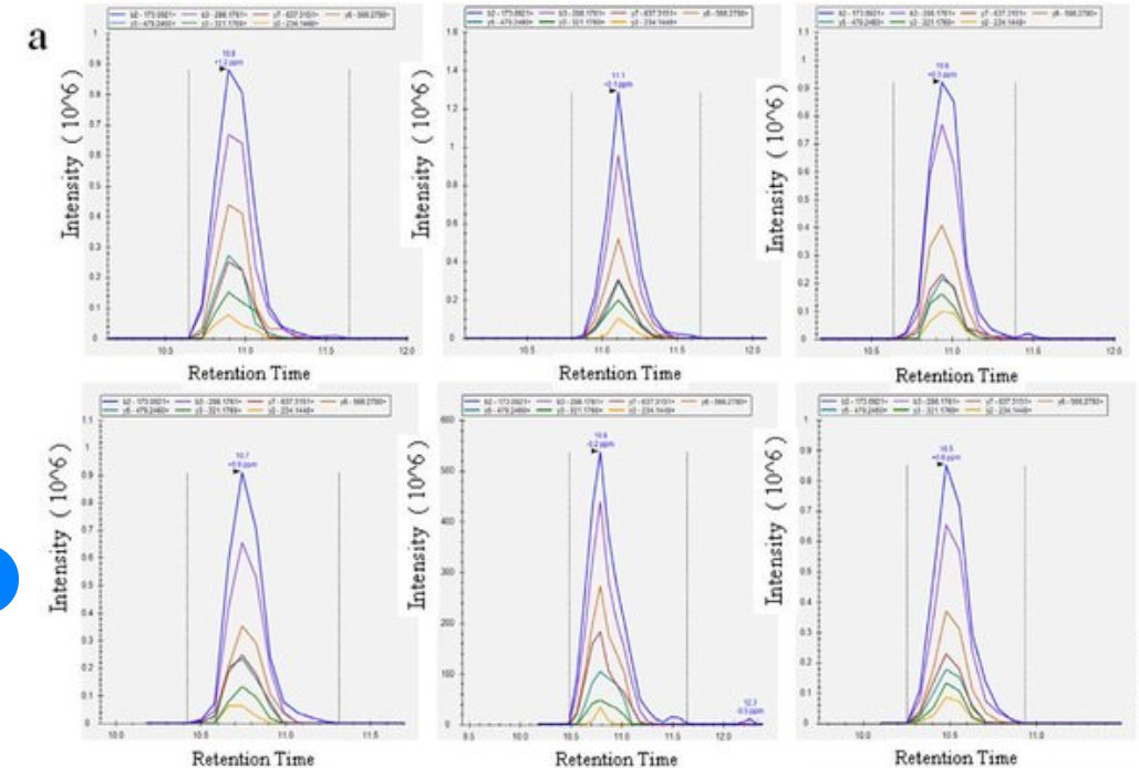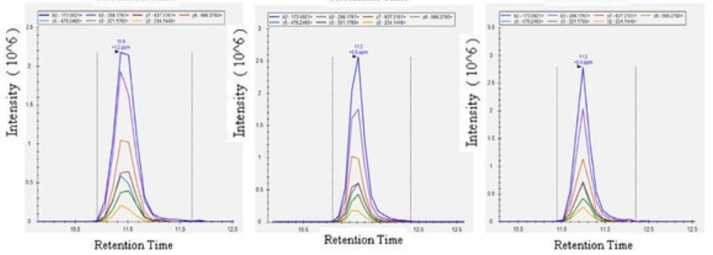 (a)测定了3-磷酸甘油三磷酸脱氢酶的丰度。从肽TALVEADDFASGTSSK中提取的碎片离子的色谱图。(b)对3-磷酸甘油脱氢酶肽的PRM分析的定量性能。获得了高度一致的结果。