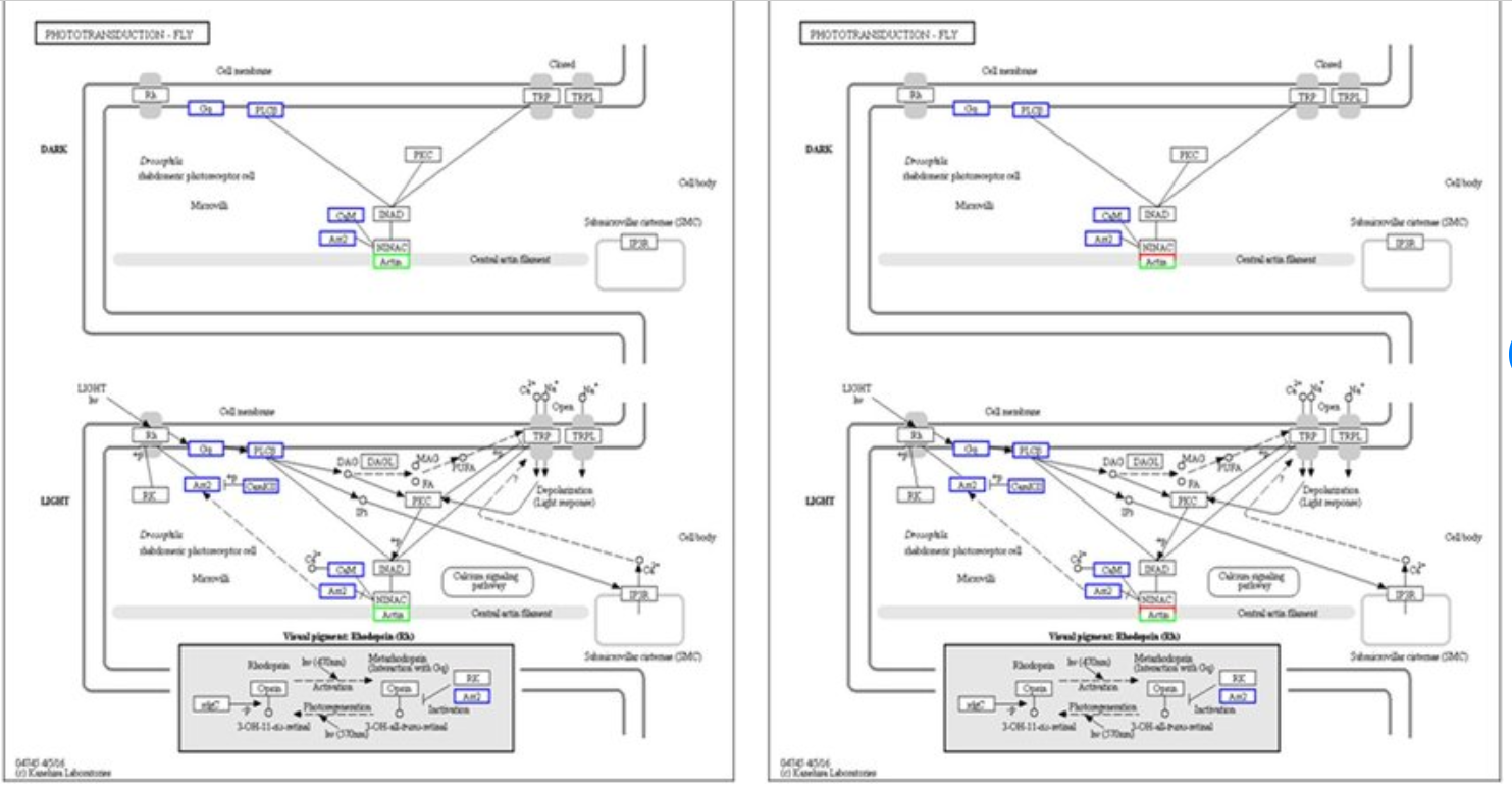 (a)BW vs. SUM中的代表性KEGG光转导通路map04745,以及(b)AW vs. BW中的代表性KEGG光转导通路map04745;