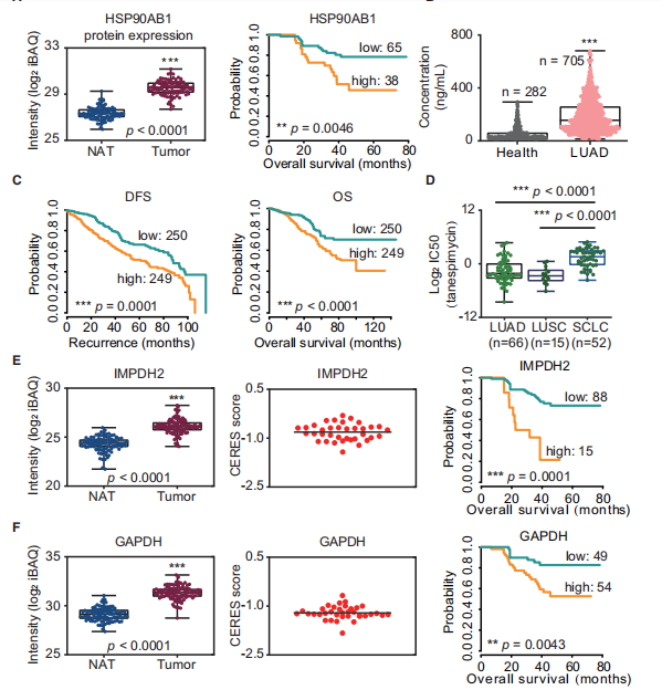 借助磷酸化蛋白质组学分析,研究者发现在不同的蛋白质组亚型患者中或存在激活的信号通路和激酶;通过整合分析蛋白质组数据和临床数据,发现了27个潜在的血浆生物标志物和多种肺腺癌药物靶点,而其中名为HSP 90β的潜在生物标志物或许需要在后期的独立研究中进行证实。(图4)