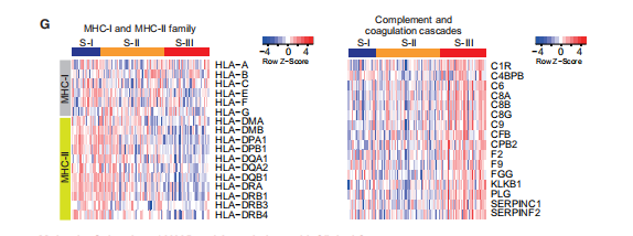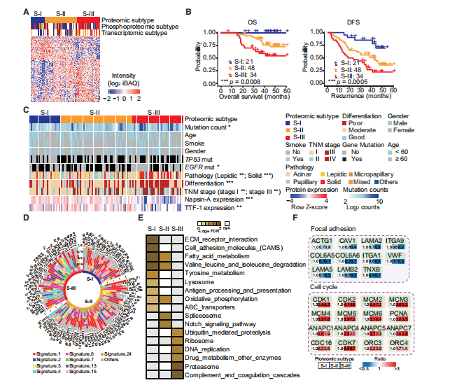 研究者将所有肺腺癌患者分为三种蛋白质组学亚型,即S-1、S-II和S-III,每一种亚型都含有不同的分子和临床特征,经过全面的生物信息学分析,发现S-I期患者与细胞环境和良好预后直接相关,相比之下,S-II期患者则与细胞增殖、蛋白质组稳定及不良预后直接相关。(图3)